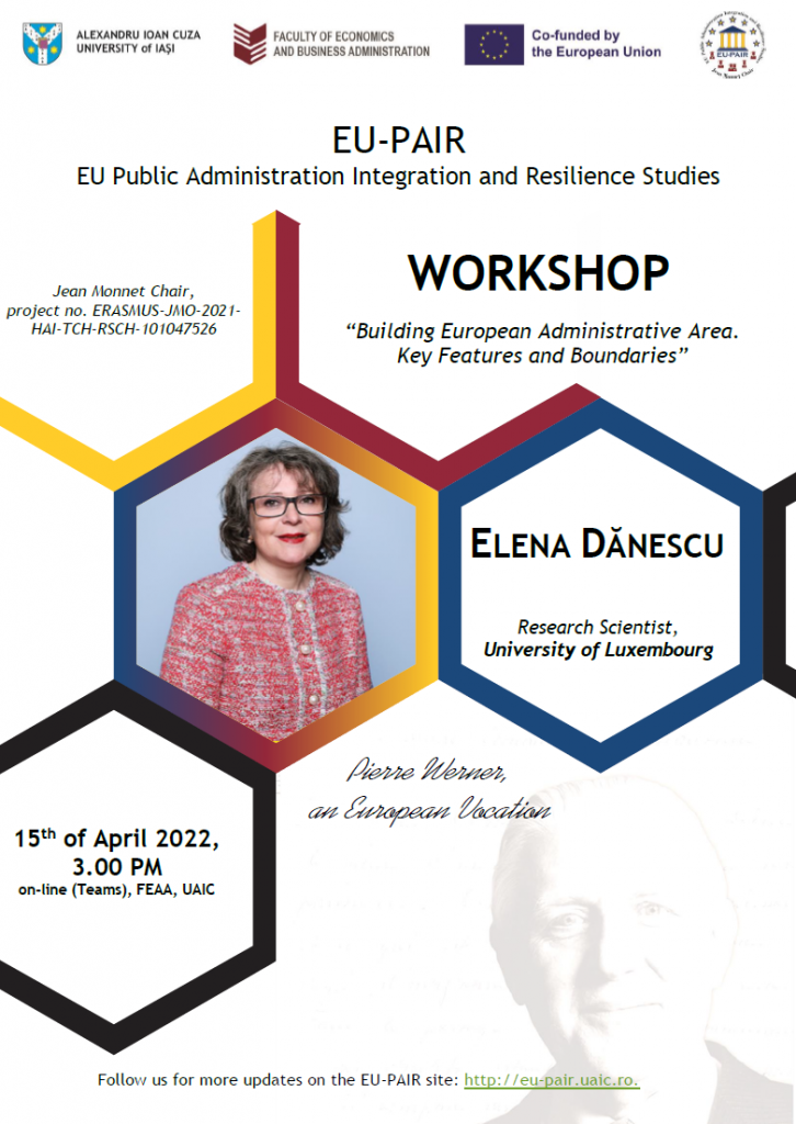 The workshop” Building European Administrative Area. Key Features and Boundaries” focused on Pierre Werner (29th of December 1913 – 24th of June 2022) vision about Europe that exceed the boundaries of economic, historical, and political arguments and inspired the new dimensions of Europe through economic and monetary integration. His role in building a united Europe with a strong monetary union and defining this as the long-term goal is remarkable. In this regard, our invited speaker, PhD. Elena Dănescu from University of Luxembourg will give a presentation about Pierre Werner’s contribution to economic and monetary integration in the EU.